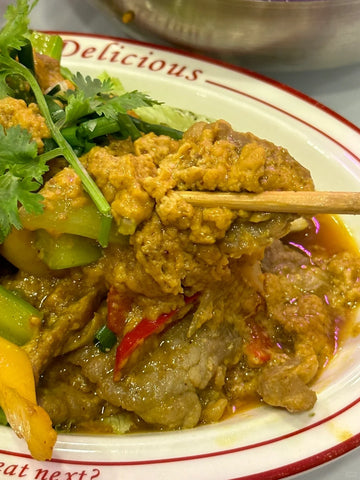 Pad Pong Karee Beef slice with Curry powder soft eggs: