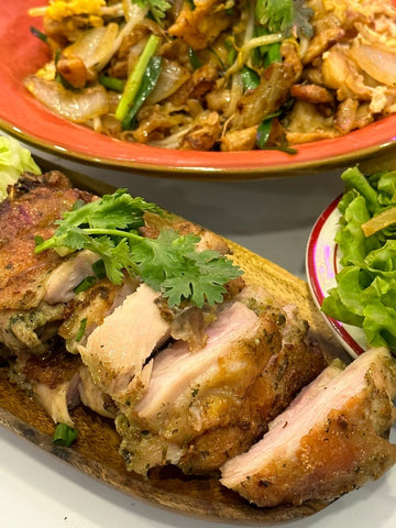 The chicken is really tender, juicy, and the skin is thin and crispy.